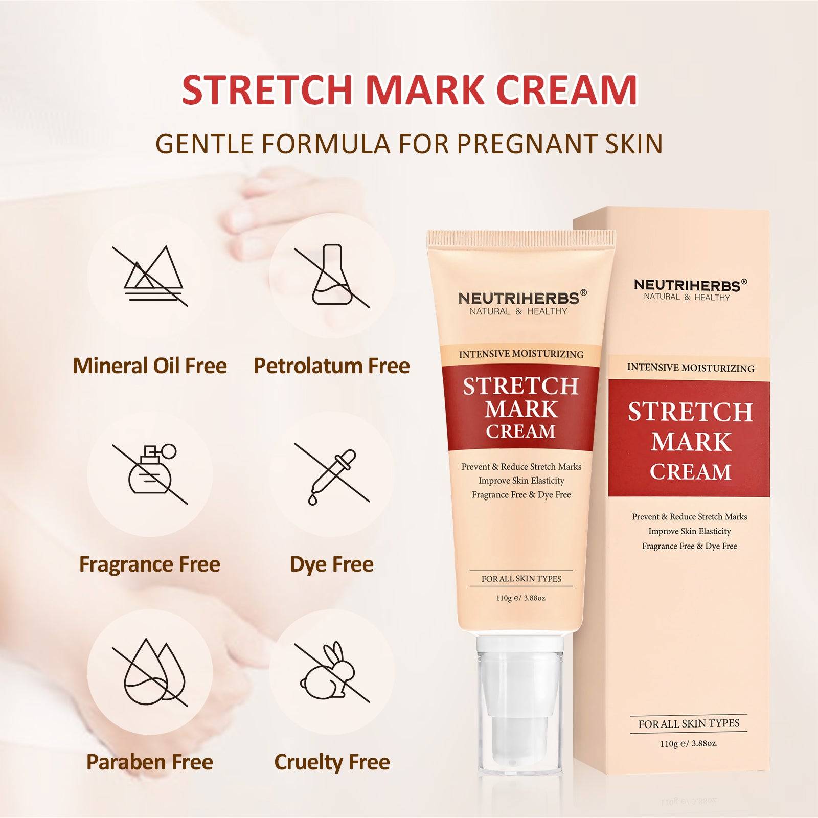 Neutriherbs gentle stretch mark cream that addresses stretch marks caused by pregnancy and weight fluctuations, reduce the look of stretch marks and helps prevent the look of future stretch marks. While helps produce collagen to improve skin elasticity and allow skin to stretch more easily. This non-greasy lotion is ideal for all over body use, in place of your regular moisturizer.