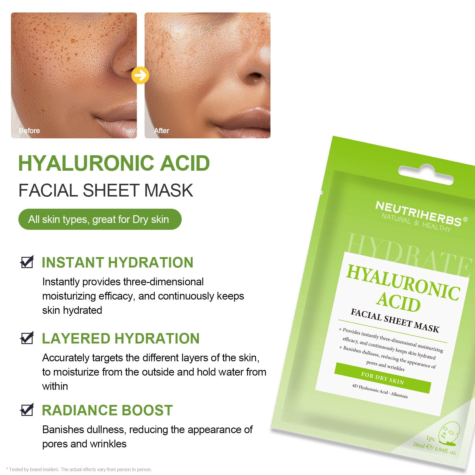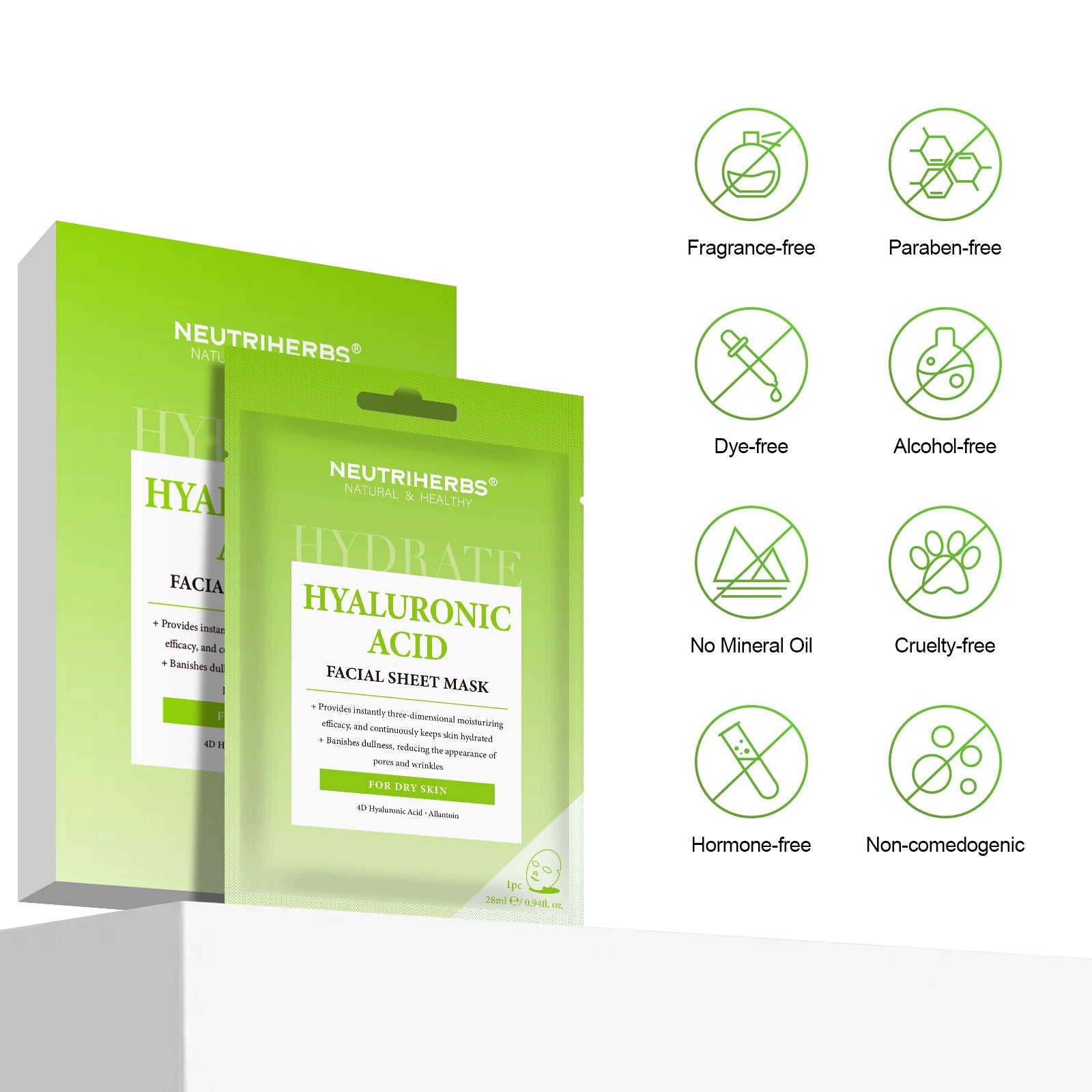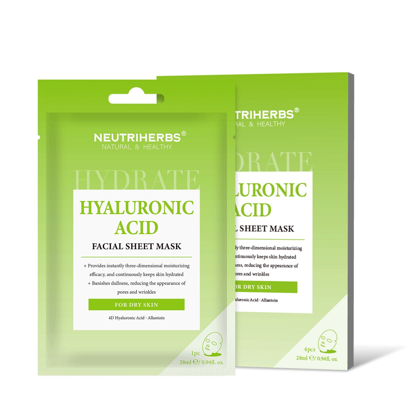 Neutriherbs Hyaluronic Acid Facial Sheet Mask leverages 4D-Hyaluronic Acid, a combination of four kinds of hyaluronic acid with different properties, to build up and form a three-dimensional network which accurately targets the different layers of the skin, to hydrate the skin from the outside and hold water from within. In this way the skin is moisturized and hydrated completely and improves in elasticity directly from within, making the skin smooth and elastic.