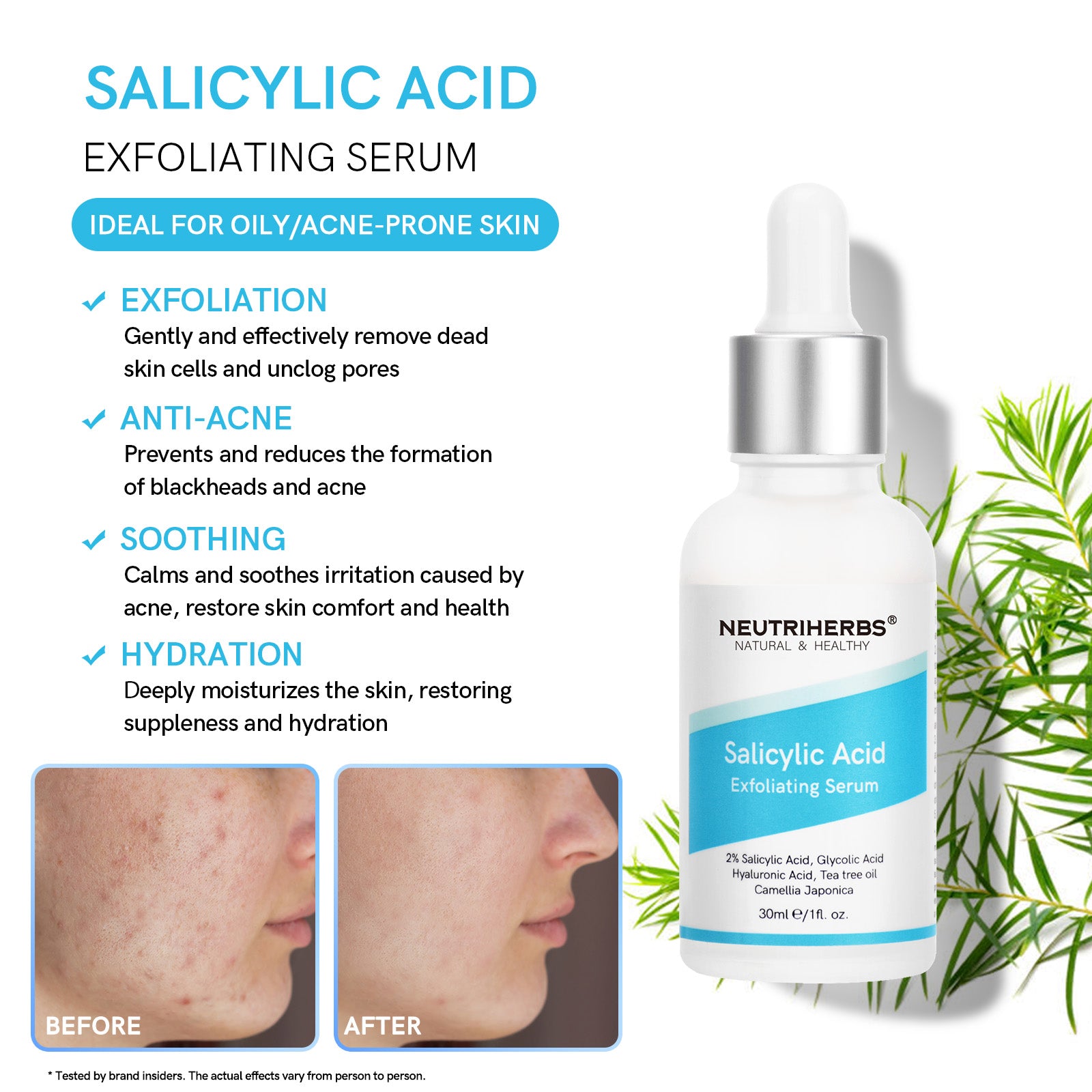 With an enhanced formulation of 2% BHAs and Glycolic Acid, salicylic acid serum can stimulate cell renewal while fighting acne, blackheads, and whiteheads. Camellia Japonica and tea tree extracts soothe and calm redness and irritated skin.