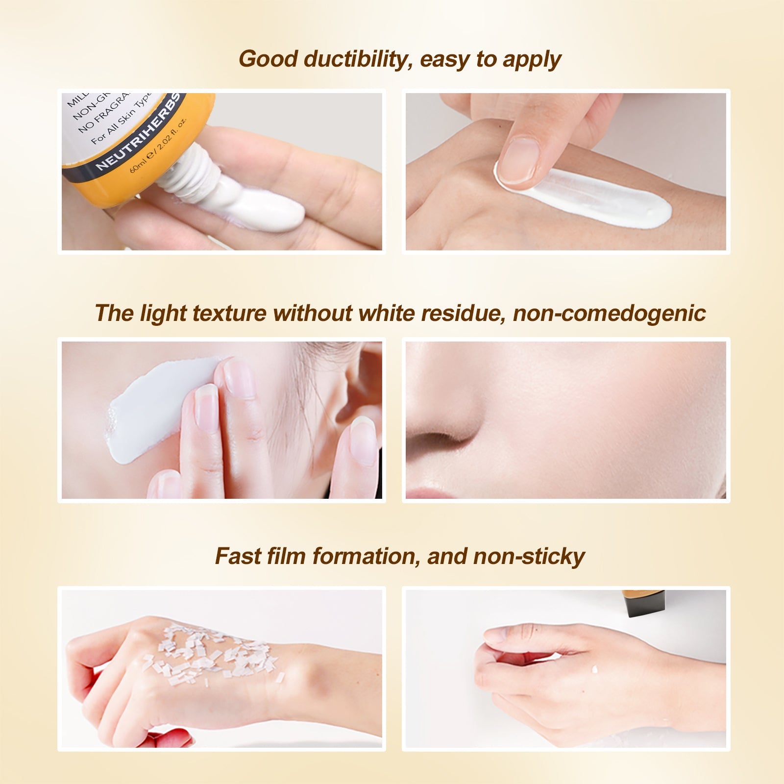 Neutriherbs Sunscreen SPF30 is formulated with multi-protection essence, VITAMIN E and VITAMIN C, which provide anti-oxidant and anti-dullness properties. It can brighten your skin for a more luminous complexion. Titanium Dioxide also helps protect against skin-aging UVA and burning UVB rays. Ideal for daily use to hydrate and protect, leaving the skin with a healthy glow.